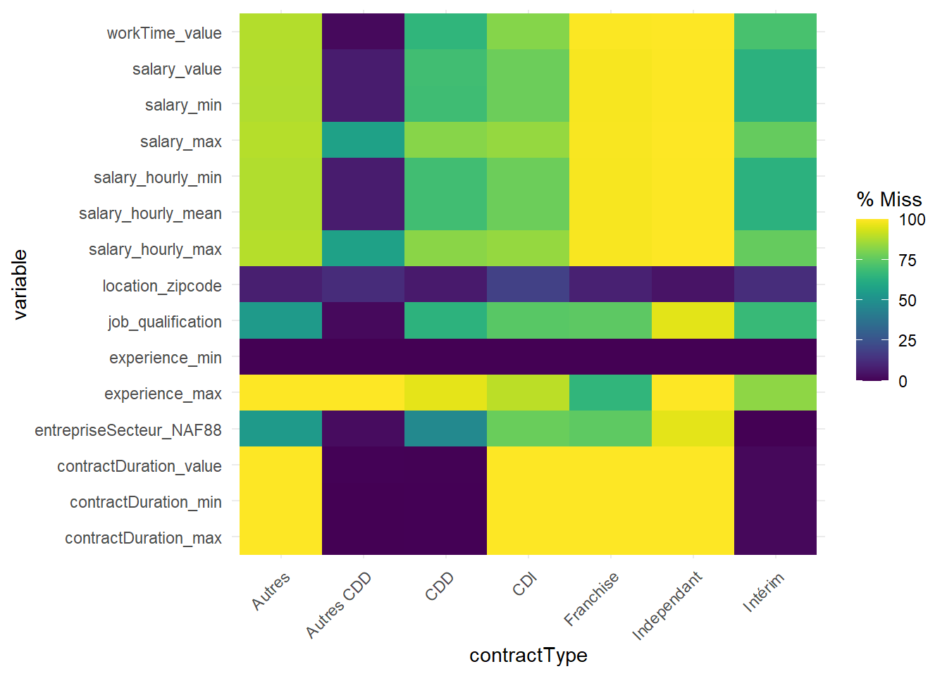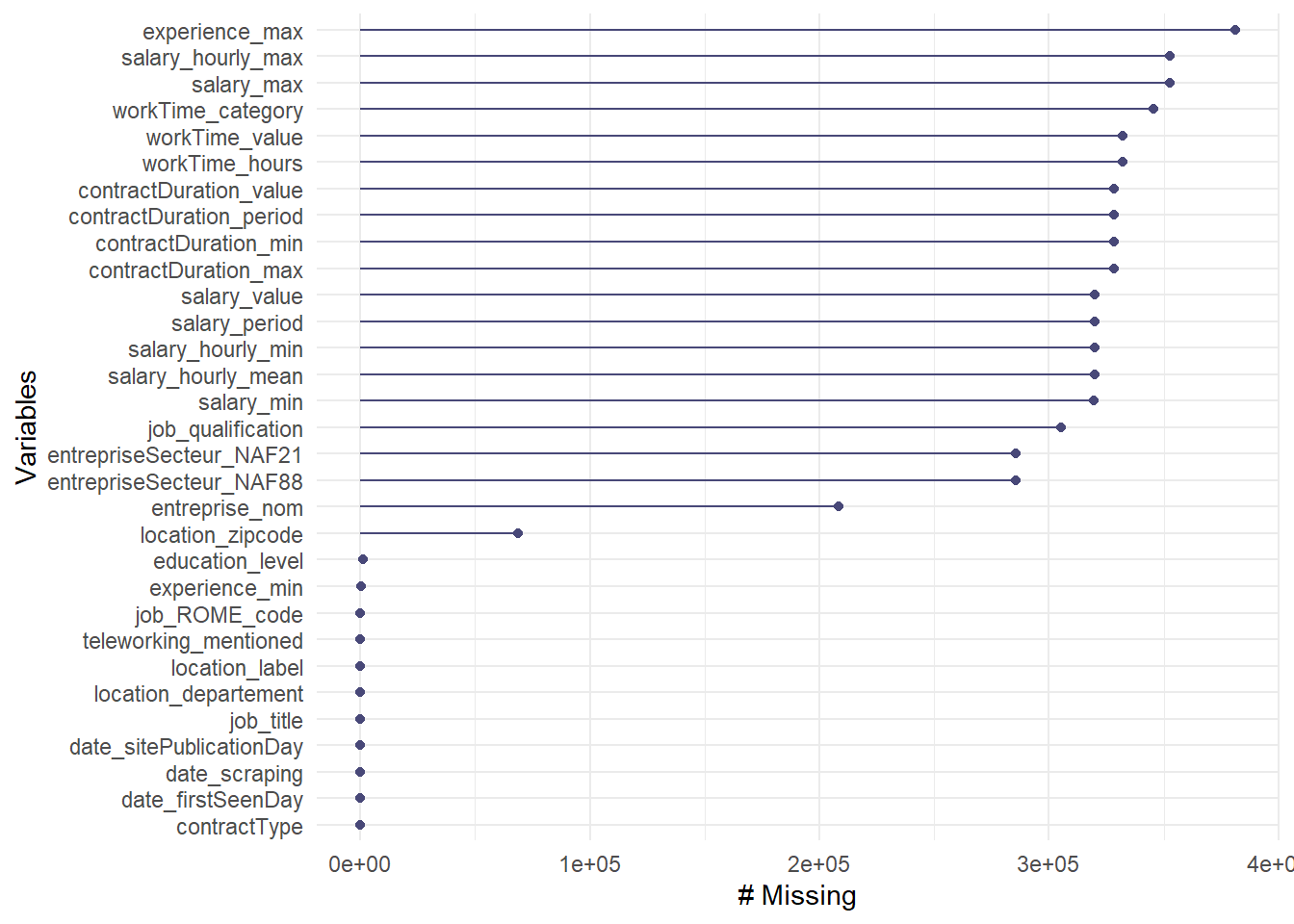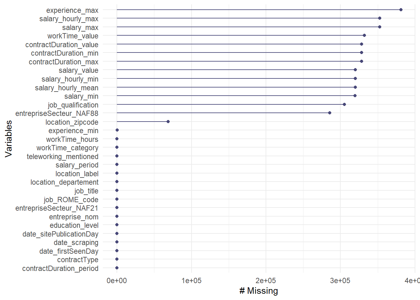 Une fois copiée dans le dossier “data/” du projet R, ouvrons cette base de données et commençons l’exploration de ses variables et de leurs valeurs manquantes :