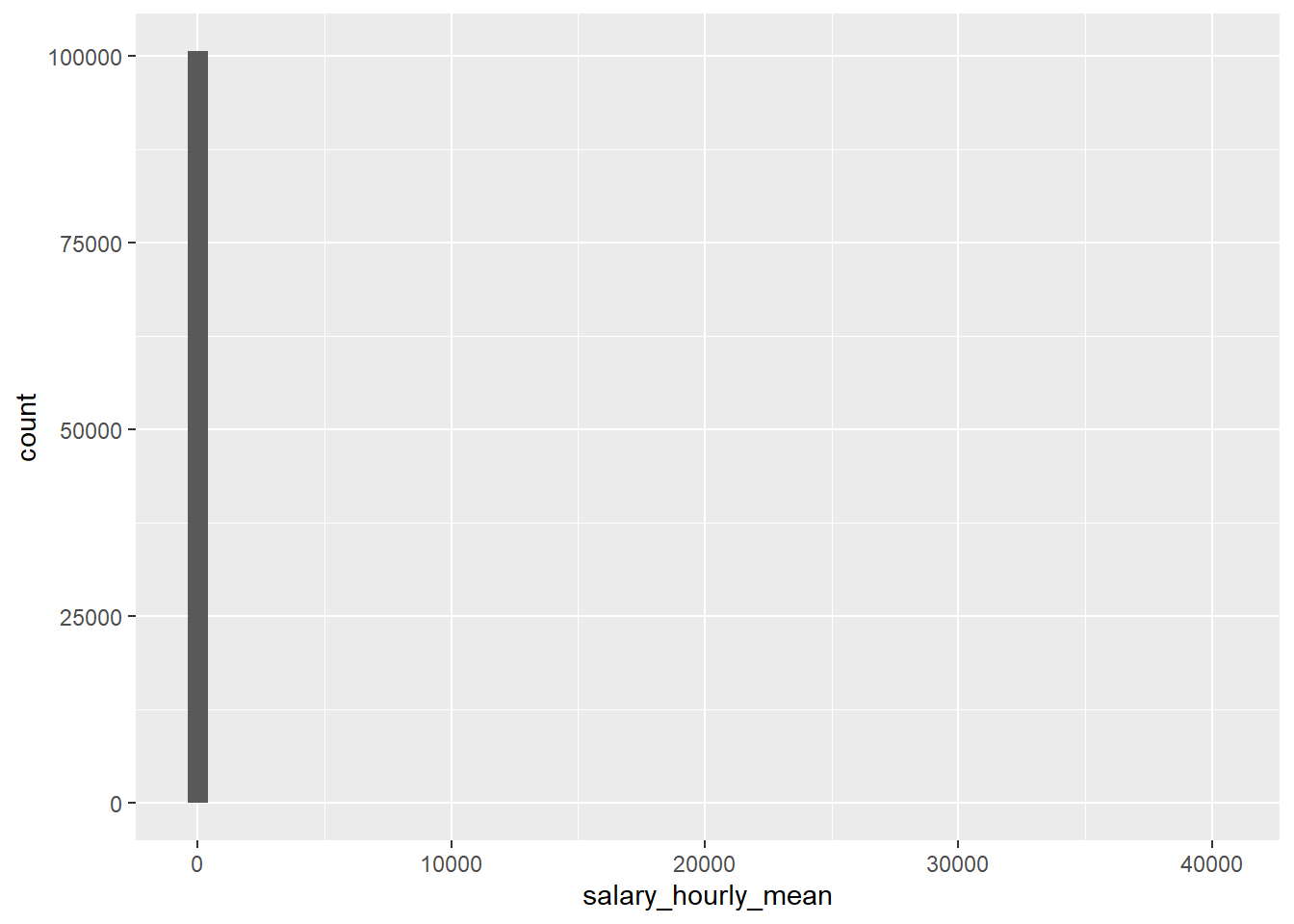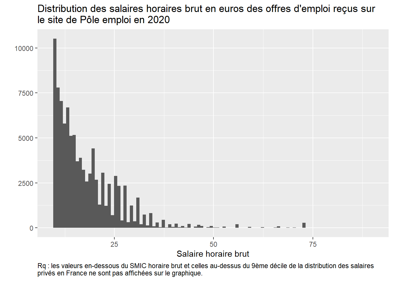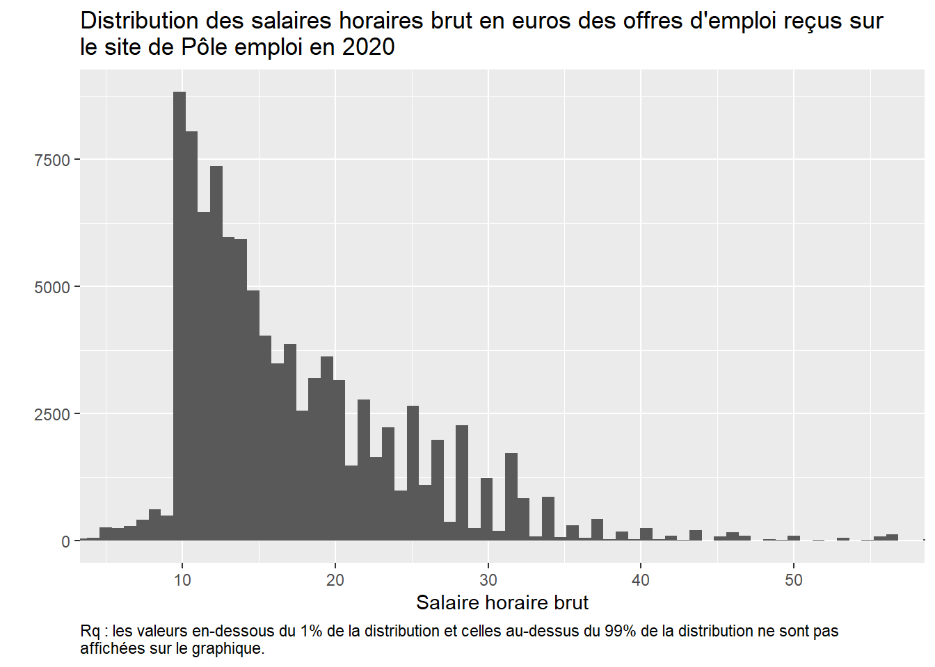 OffresPE_2020 %>%ggplot() +aes(salary_hourly_mean) +geom_histogram(bins=50000) +coord_cartesian(xlim=c(quantile(OffresPE_2020[!is.na(OffresPE_2020$salary_hourly_mean), ]$salary_hourly_mean, 0.01),quantile(OffresPE_2020[!is.na(OffresPE_2020$salary_hourly_mean), ]$salary_hourly_mean, 0.99))) +labs(title ="Distribution des salaires horaires brut en euros des offres d'emploi reçus sur \nle site de Pôle emploi en 2020", y="", x="Salaire horaire brut",caption="Rq : les valeurs en-dessous du 1% de la distribution et celles au-dessus du 99% de la distribution ne sont pas \naffichées sur le graphique.") +theme(plot.caption =element_text(hjust=0))