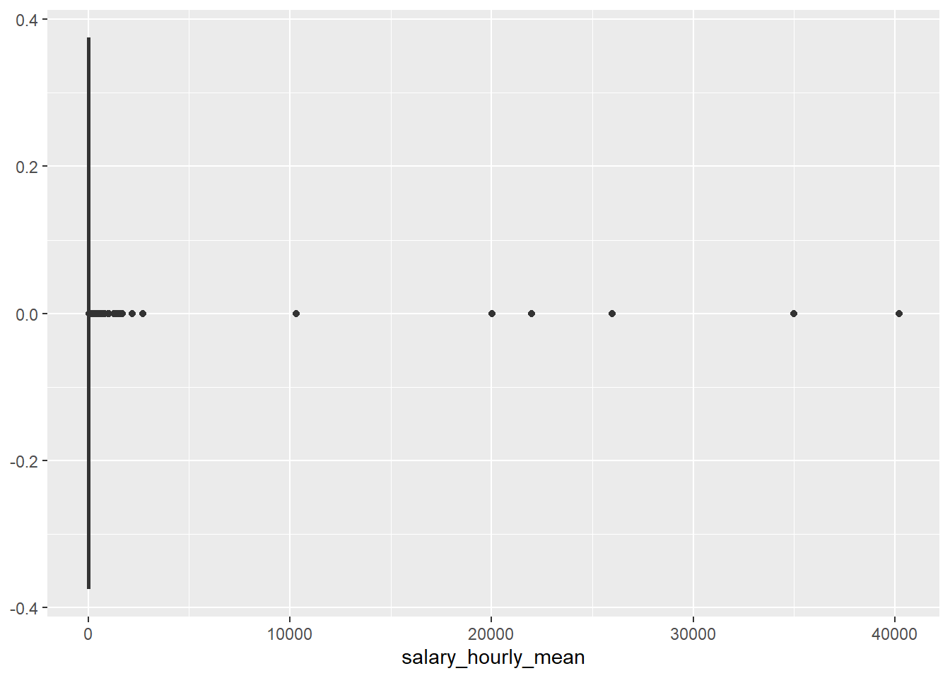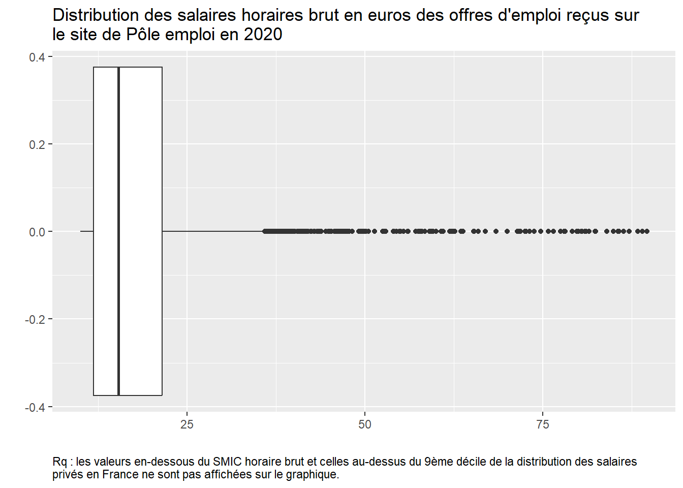 # On peut filtrer directement avec des valeurs de salaire horaire brut "connu" # (comme la valeur du SMIC ou la valeur du 9ème décile, cf. site de l'Insee)OffresPE_2020 %>%filter(salary_hourly_mean>=10& salary_hourly_mean<90) %>%ggplot() +aes(y = salary_hourly_mean) +geom_boxplot() +coord_flip() +labs(title ="Distribution des salaires horaires brut en euros des offres d'emploi reçus sur \nle site de Pôle emploi en 2020",y="", x="", caption="Rq : les valeurs en-dessous du SMIC horaire brut et celles au-dessus du 9ème décile de la distribution des salaires \nprivés en France ne sont pas affichées sur le graphique.") +theme(plot.caption =element_text(hjust=0))
