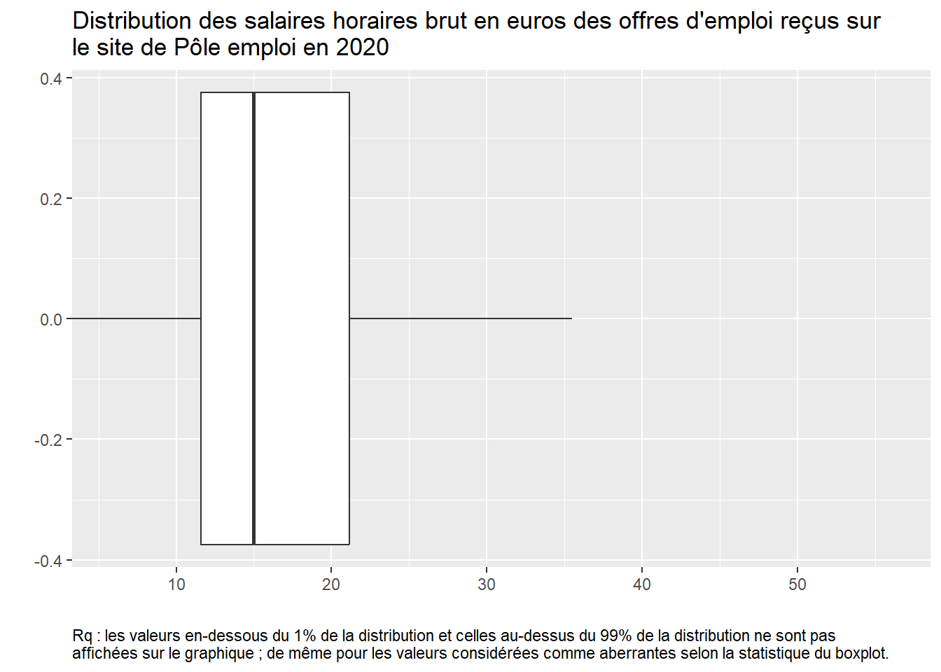 OffresPE_2020 %>%ggplot() +aes(y = salary_hourly_mean) +geom_boxplot(outlier.shape =NA) +coord_flip(ylim =c(quantile(OffresPE_2020[!is.na(OffresPE_2020$salary_hourly_mean), ]$salary_hourly_mean, 0.01),quantile(OffresPE_2020[!is.na(OffresPE_2020$salary_hourly_mean), ]$salary_hourly_mean, 0.99))) +labs(title ="Distribution des salaires horaires brut en euros des offres d'emploi reçus sur \nle site de Pôle emploi en 2020", y="", x="", caption="Rq : les valeurs en-dessous du 1% de la distribution et celles au-dessus du 99% de la distribution ne sont pas \naffichées sur le graphique ; de même pour les valeurs considérées comme aberrantes selon la statistique du boxplot.") +theme(plot.caption =element_text(hjust=0))