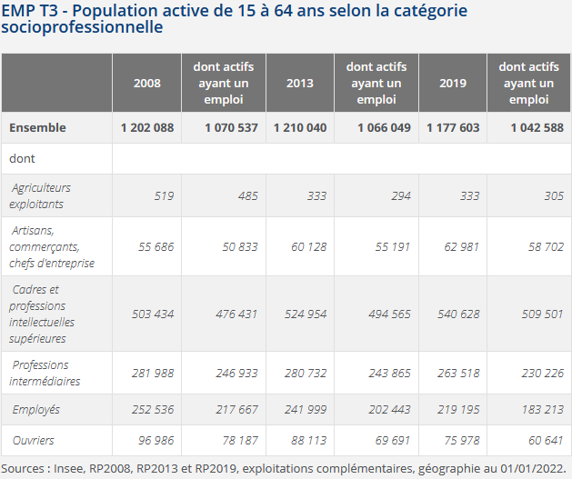 Maintenant, affichons les deux dernières colonnes (‘2019’ et ‘dont actifs ayant un emploi’) de ce tableau tiré du site de l’Insee, en mettant la ligne “Ensemble” plutôt en fin de tableau (ces 2 usages sont possibles, question de préférence…). Attention encore une fois au champ de ce tableau… Pour cela, on va :