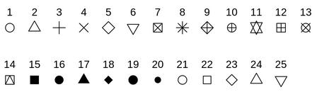 Pour la liste des symboles (“shape”) et le numéro correspondant que l’on appelera avec l’argument shape=, ci-dessous un récapitulatif :
