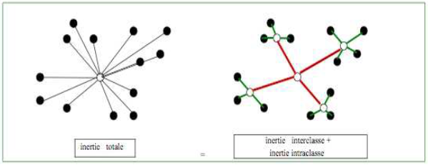 enfin, la troisième étape est la méthode d’agrégation : dans la construction de la matrice de distance, après la 1ère étape (n-1 individus), ce seront progressivement des groupes d’individus dont on comparera la distance, il faut donc savoir comment calculer cette distance entre groupes (et non plus seulement entre individus) : est-ce qu’on prend le point représentant l’individu moyen du groupe ? Ou bien celui qui est à l’extrêmité du groupe ? Etc. Là aussi, il faut donc choisir cette méthode d’agrégation parmi un ensemble de méthodes (lien simple ou minimum, lien maximum, lien moyen, lien entre les centroïdes/centres de gravité ou barycentre, critère de Ward) : la plus utilisée est le critère de Ward, notamment lorsqu’on utilise une distance euclidienne dans l’étape précédente. Ce critère se base sur la décomposition de l’inertie totale (somme du carré des distances de chaque point au centre) en une inertie intraclasse et une inertie interclasse ; il consiste ensuite à minimiser la perte d’inertie intraclasse à chaque agrégation de classes, pour que les classes restent le plus homogène possible.