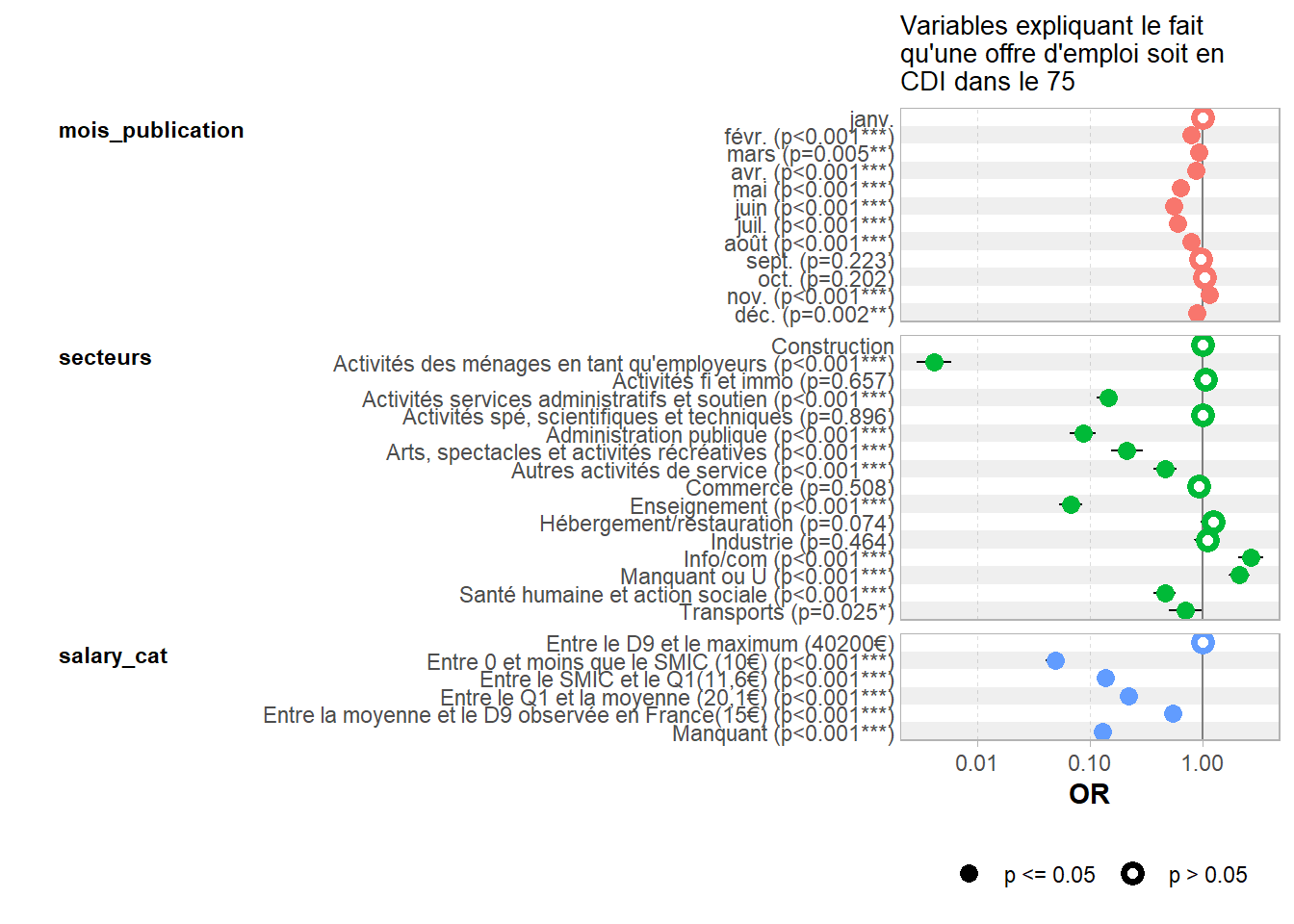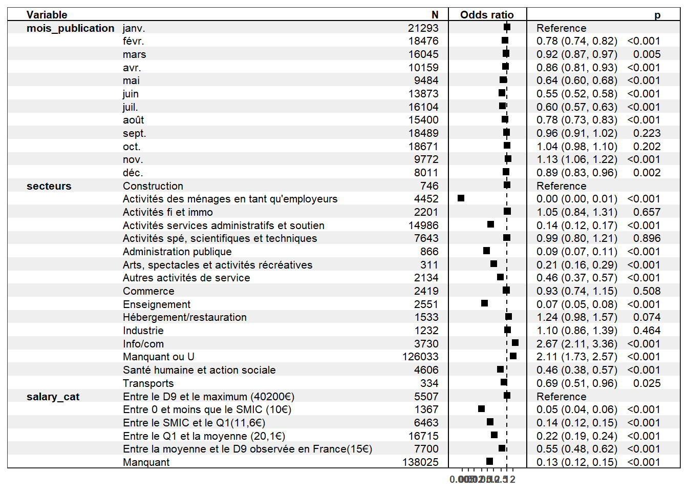 On privilégiera plutôt les deux derniers types de tableaux : ainsi, on note que la probabilité qu’une offre d’emploi soit en CDI est 1,24 fois plus élevée si l’emploi est dans le secteur de l’hébergement/restauration et 2,67 fois plus élevée dans le secteur de l’information/communication. Concernant le salaire, par rapport à la référence “Entre le D9 et le maximum (40200€)”, si l’offre d’emploi se situe dans une tranche de salaire plus faible, alors la probabilité que cette offre soit en CDI est plus faible, de 0,05 fois à 0,55 fois, soit une baisse de 45% ((1-0,55)*100) à 95% ((1-0,05)*100). Par rapport au mois de janvier, là aussi, la probabilité qu’une offre d’emploi soit en CDI est plus faible pour tous les autres mois sauf novembre, les odds-ratio étant toujours inférieurs à 1.