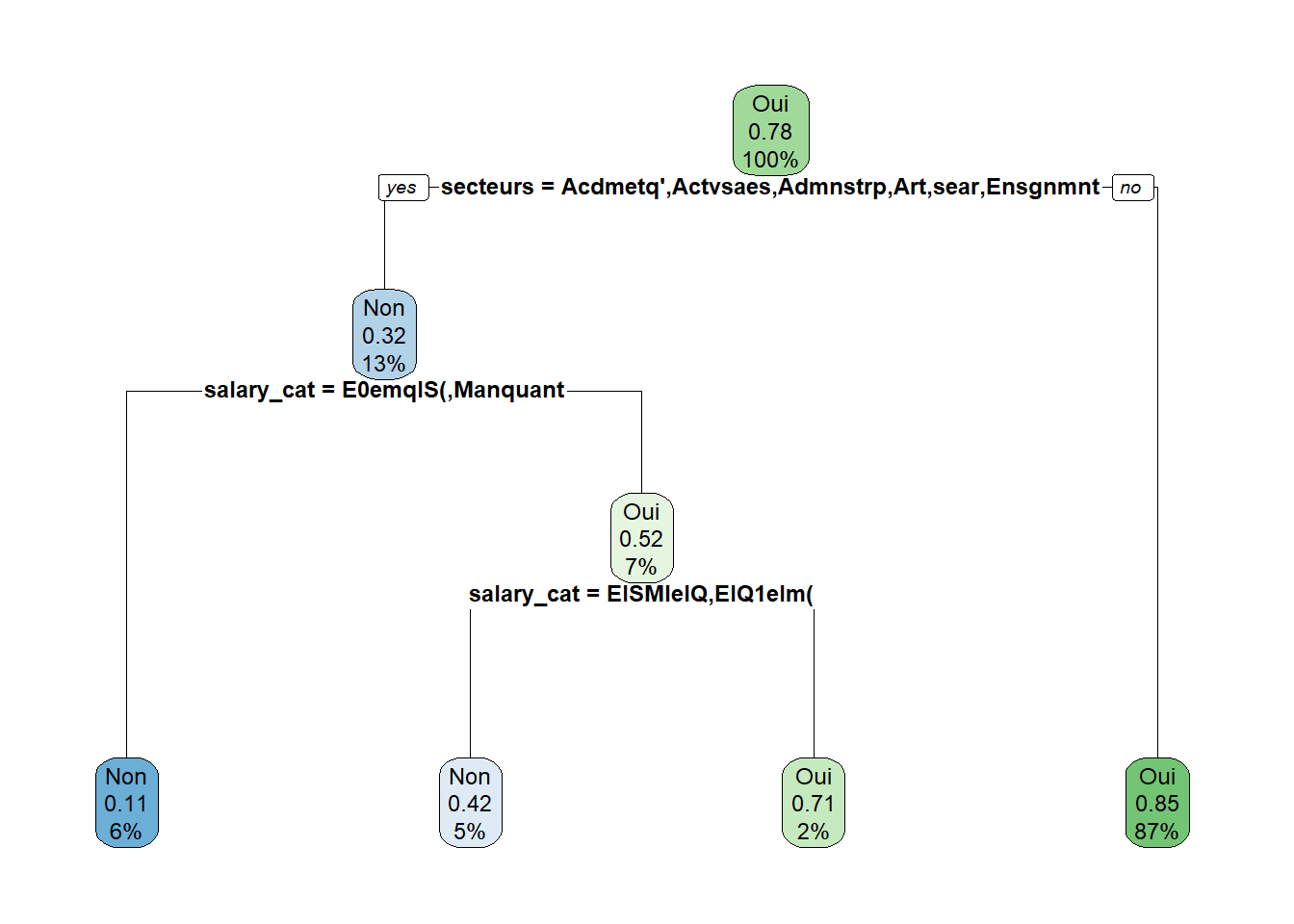 On voit donc que la branche partant sur la gauche, c’est le cas où la variable de secteurs est égale aux modalités “Activités des ménages en tant qu’employeurs”, ou “Activités services administratifs et soutien”, ou “Administration publique”, ou “Arts, spectacles et activités récréatives”, ou “Enseignement” (on voit un “yes” qui est encadré ; ça sera le cas à chaque fois même si ce n’est pas de nouveau inscrit, autrement dit la branche partant sur la gauche sera la modalité “oui” de la variable).