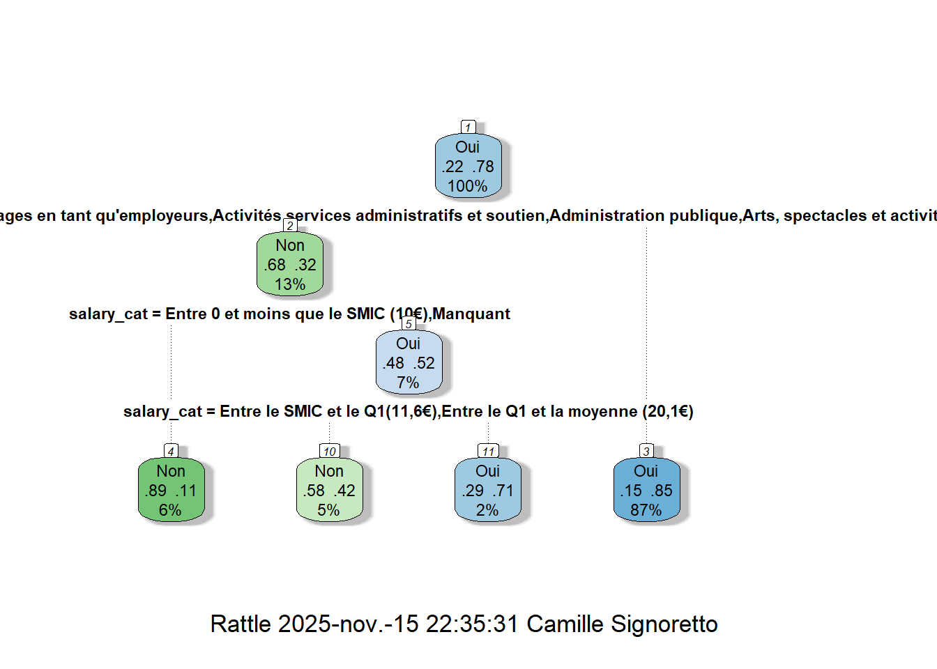 4) salary_cat=Entre 0 et moins que le SMIC (10€),Manquant 7877 902 Non (0.8854894 0.1145106) *