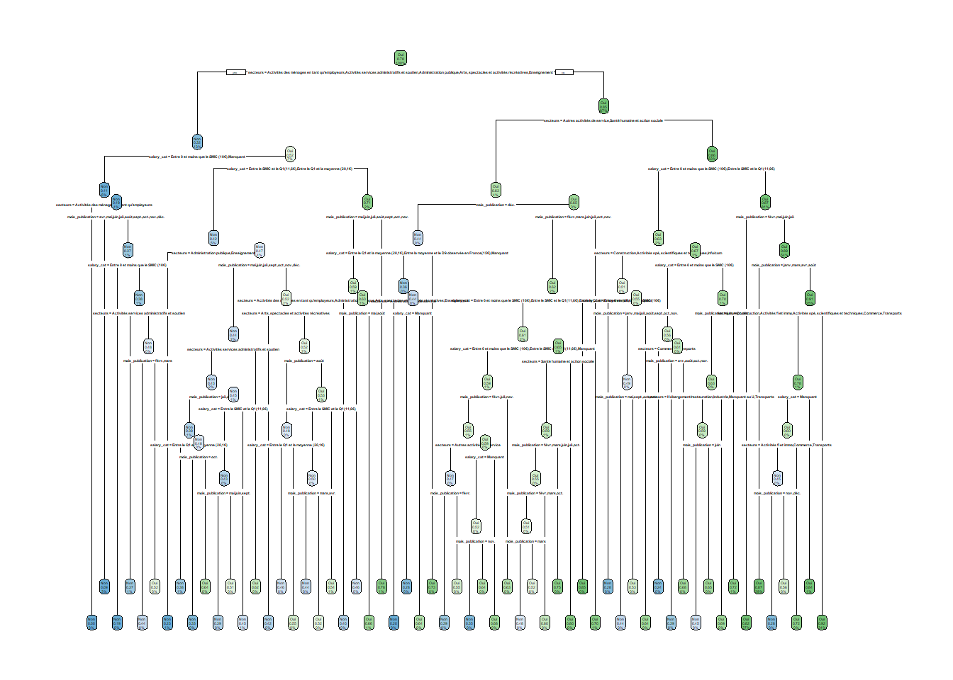 Par exemple, ici le premier noeud indiqué “root” représente l’ensemble de l’échantillon (c’est la “racine” de l’arbre), soit environ 123 000 observations, et comme la modalité prédite est “Oui”, il y a 78% d’offres d’emploi qui sont en CDI, contre 22% qui le sont pas soit environ 27 000 observations (celles qu’on perd à cette étape donc). La première variable discriminante est le secteur d’activité : celles qui se situent dans les secteurs “Activités des ménages en tant qu’employeurs”, ou “Activités services administratifs et soutien”, ou “Administration publique”, ou “Arts, spectacles et activités récréatives”, ou encore “Enseignement” forment une première branche et un groupe d’offres qui ne sont pas en CDI, alors que les secteurs de la “Construction”, ou des “Activités fi et immo”, ou des “Activités spé, scientifiques et techniques”, ou des “Autres activités de service”, ou du “Commerce”, ou de l’“Hébergement/restauration”, ou de l’“Industrie”, ou de l’“Info/com”, ou “manquant ou U”, ou de la “Santé humaine et action sociale”, et enfin des “Transports” forment l’autre branche et un groupe d’offres en CDI. Ensuite, pour le premier groupe de secteurs, une autre division se forme selon le niveau de salaire : si l’offre propose un salaire “Entre 0 et moins que le SMIC (10€)” ou est manquant un autre groupe va se former qui ne sera pas en CDI, alors que si l’offre propose un salaire au-dessus du SMIC alors l’offre sera en CDI, ce dernier groupe se divisera lui-même encore en deux groupes selon d’autres modalités du salaire.